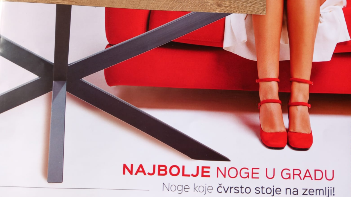 Seksističko oglašavanje? Sudaramo se s njim na svakom koraku. Lijepe i obavezno mlade žene smiješe se s oglasa za suđe, kućanske aparate, automobile, garažna vrata, shopping centre…, a njihove seksi noge, stražnjice ili grudi tu su da privuku pažnju potencijalnih kupaca. Lijepe ženske noge na fotografiji koju objavljujemo trebale bi prodati nogare za stolove od kojih mnogi nose ženska imena.